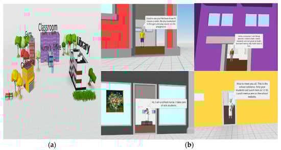 By Cospaces Edu, teacher-trainees created five buildings with the same color (Figure 9a) and put 3D human objects in each building speaking the same information provided in a textbook (Figure 9b). Whereas a learner with a digital textbook gains linguistic information on a screen, a learner in this 3D space access the reading information by roaming around the campus, getting into the inside of each building, and clicking on the 3D objects.