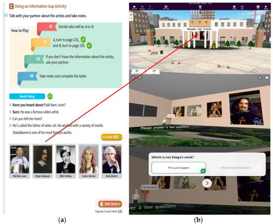 (a) An activity introducing six artists and their masterpieces in a digital textbook; (b) A 3D museum of Diego Velazquez created by Cospaces Edu and a quiz related to Diego’s works coded by Coblox.