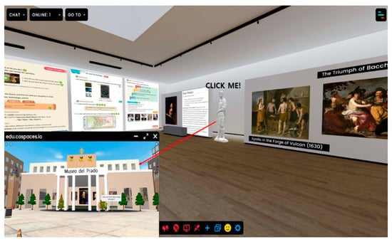 As seen in the previous subsection, through VR contents created by Cospaces Edu, students will be more likely to experience learning contents with a high level of 3D immersion. However, it is questionable, as the textbook’s prompt requests, whether a student can make a model dialogue and share it with a partner because Cospaces Edu allows a single user to experience 3D contents that does not provide synchronous learning experience based on a sense of togetherness and presence. Therefore, a concept of a metaverse plays a crucial role in creating a learning space where students’ avatars can learn though social communication with other peers and a teacher. For example, in Frame VR below in Figure 12, teacher-trainees put images of a digital textbook and exhibited Diego’s works in a gallery. The learners can get into this space to look around the exhibition, and if they click the plaster figure in the middle of the room (that teacher-trainees uploaded as a 3D object), the link created by Cospaces Edu will pop up so that learners experience the VR contents based on a human interaction.