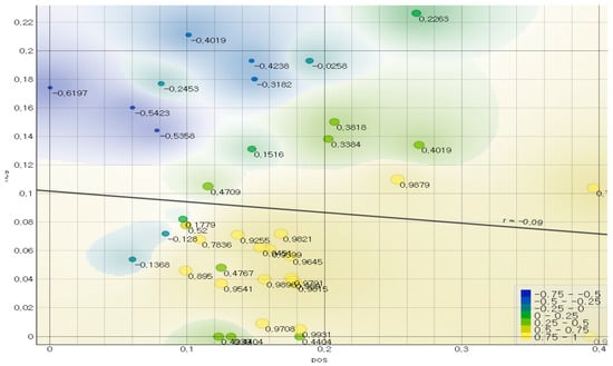 As sentiment analysis with VADER is sensitive to not only polarity (positive/negative) but also intensity (strength) of emotions, a scatter plot of sentiments was used to statistically display the univariate sentiment values (Figure 14). The x-axis denotes positive scores whereas the y-axis denotes negative scores of the reflective papers on evaluations. The findings show the left side of the density plot deviating from the line. This can computationally suggest that VRM experience seems to yield quite positive responses.