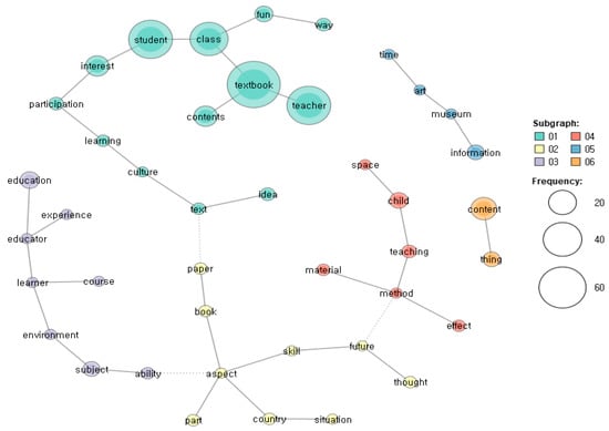 The co-occurrence network in Figure 15 displays the associated relationships between words and variables. The most noted and frequently addressed words in reflective papers were “student”, “teacher”, and “textbook”. Several characteristic words such as “fun”, “interest”, “learning”, ”class”, “culture”, and “participation” appear in the co-occurrence network and such positive words might exude pre-service teachers’ beliefs that VR instructional contents can motivate students to learn through participation and sustain interest in their own learning. In addition, some tangible words such as “culture”, “museum”, and “art”, directly reflect the participants’ actual tasks of their experiential VRM learning. This indicates that such concrete learning-to-teach practices can stimulate pre-service teachers to reflect upon the experience, which can become a catalyst to fine-tune their pedagogical repertoires and professional competence for sustainable education.