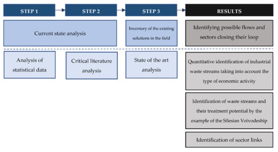 To achieve the main objective of the paper—to indicate possible waste flows and identify sectors closing their loop according to the assumptions of industrial symbiosis, the following steps were carried out: