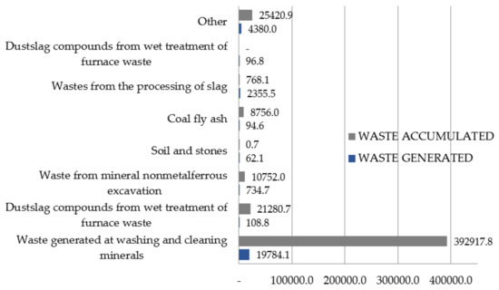 The specification of the industrial waste generated in the appropriate categories of economic activity is in Table 3, which presents the specified types of waste assigned to the relevant scope of economic classification groups. In this list, mineral waste deserves special attention, accounting for 44.9% of all industrial waste generated in the country and directly related to the mining plant. Incinerated waste accounts for 15.5% of the total waste generated directly related to the energy industry (section D) and the steel industry (section C).