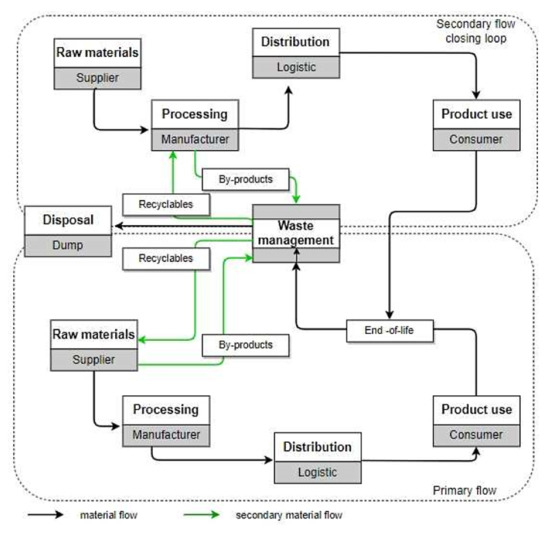 The basic links in each waste management system are waste producers, waste collection and transport units, and waste management entities [41]. According to the circular economy, waste becomes a valuable resource that comes back into circulation and can be reused [29]. Figure 3 shows a schematic image of the material flow model, taking into account the added value of reusable waste. The key element of the model in this approach is the waste management system, which, from the point of view of a single plant as well as the entire industry, allows the combination of often separate industry sectors that use the specific properties of waste, thus replacing natural resources.