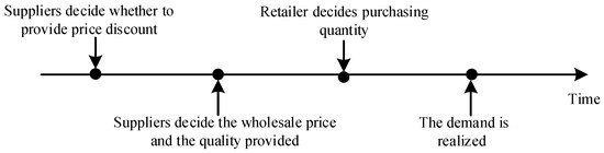 A Stackelberg game is played between the suppliers and the retailer. The suppliers are the leader in the game relationship and the retailer is the follower. The game sequence is as follows: First, the suppliers decide whether to provide a price discount. Second, the suppliers decide the wholesale price and the quantity provided. Third, the retailer decides purchasing quantity according to the price and EOQ model. Finally, the demand is realized. Figure 1 describes the sequence of the events.