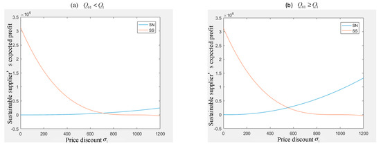 Figure 2a,b reflect the effect of on the sustainable supplier’s expected profit when only one supplier provides price discounts and two suppliers both provide price discounts separately. In the case in which only the sustainable supplier offers price discounts, and another supplier has not taken any action, the greater the discount is provided, the more market share will be attracted. We take the supplier’s 40% profit as the standard and set the maximum quantity discount to 1200 and, comparing with the Figure 2b, we find that the sustainable supplier’s expected profit rise rate is greater when the original order quantity of the retailer is less than the critical value of the price discount provided by the supplier. When two suppliers both provide price discounts, according to the principle of game theory, there is a competitive relationship between the two suppliers. One party increases the discount and the other will follow closely. Then, the expected profit of the two suppliers will decline. On the one hand, both suppliers provide price discounts, and neither supplier will get more market share; on the other hand, as the quantity discounts continue to increase, the expected profit will also decline.