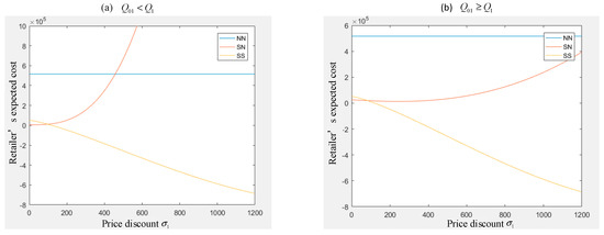 Figure 3a,b reflect the effect of on the retailer’s expected cost. According to Lemma 2, the quantity that the supplier provided will be less with the increase of ; therefore, the retailer has to purchase more from the other supplier, and the retailer’s expected cost will be higher. Comparing Lemma 2 and Lemma 3, it is not difficult to find that the influence of the change of on the retailer is reduced when the retailer’s original order quantity is greater than the price discount threshold provided by the supplier; therefore, the curve in Figure 3b is relatively flat. In addition, when two suppliers both provide price discounts, the two suppliers conduct a dynamic game with symmetric information. The price discounts will tend to be the same and continue to increase during a certain static period. This game process will also make the retailer’s purchase cost continue to decrease.
