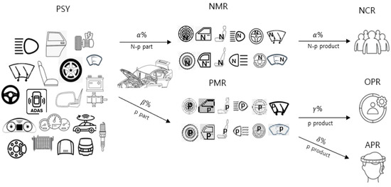 The proposed SSCN model considers the manufacturing and supply chain of Eco-friendly vehicles and consists of a parts supplier (PSY), non-personalization manufacturer (NMR), personalization manufacturer (PMR), non-personalization customer (NCR), ordinary personalization customer (OPR), and advanced personalization consumer (APR). The conceptual flow of the model is illustrated in Figure 1. Parts supply is categorized into two types: non-personalization parts (N-p part) and personalization parts (p part). The N-p parts, represented by α%, are shipped to the NMR, and the p parts, represented by β%, are shipped to the PMR. The finished N-p and p products are produced by the NMR and PMR, respectively. Finally, the finished N-p products are shipped to the NCR and finished p products are shipped to the OPR or APR.