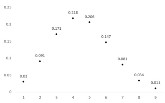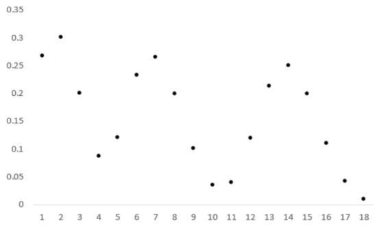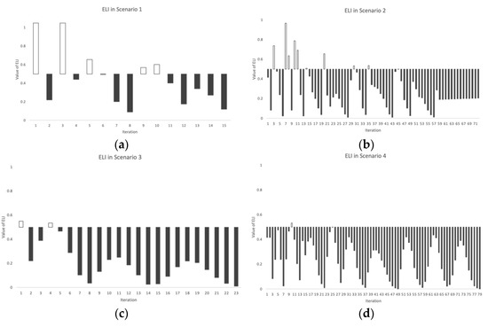 The ELI values in each scenario are also shown in Figure 4. As shown in Figure 4a, there are five advanced levels (A) and nine ordinary levels (O). The values representing level A are 1.05, 1.05, 0.655, 0.569, and 0.602, and the values representing level O are 0.22, 0.44, 0.494, 0.201, 0.088, 0.402, 0.176, 0.34, 0.27, and 0.12. The contents of Scenario 2–4 are shown in Figure 4b–d, respectively. From these figures, the level of each product can be confirmed. For example, 9 out of 73 values are shown as level A in Scenario 2, and the remaining 64 values are level O. In Scenario 3, among the 23 ELI values, two belong to level A and the remaining to level O. In Scenario 4, only two values of 73 represent level A.