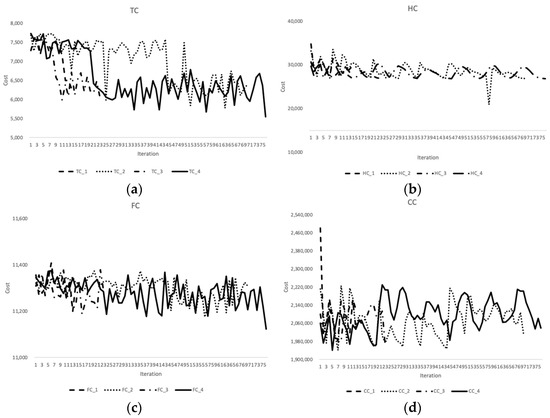 The same experimental results for the SSCN model are shown in Figure 5. The experimental results of TC in the four scenarios can be obtained in one graph as shown in Figure 5a. The experimental results for HC, FC, and CC in the four scenarios are shown in Figure 4b–d, respectively. In Figure 5a, the TC values show different curves in various scenarios in terms of the A and O levels. The HC and FC values show similar curves in the four scenarios in Figure 4b,c. In Figure 4d, the CC values show different curves in the four scenarios with various ELI values.