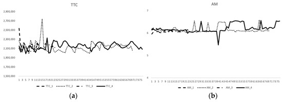 The experimental results of TTC and AM for the four scenarios are shown in Figure 6. In Figure 6a, the values of TTC and AM values show similar curves in various scenarios for different ELI values.