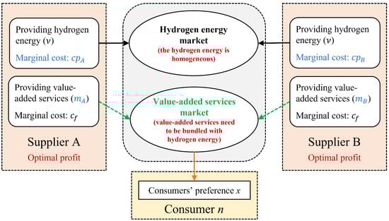 - The hydrogen energy of the two suppliers is homogeneous. The intrinsic value of hydrogen energy is ν, but the marginal cost and the intrinsic value of value-added services are different. The marginal cost of value-added services is , the same for suppliers A and B.