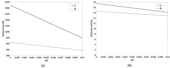 Figure 3 describes the changes in suppliers A and B’s optimal profits and optimal pricing under the NS situation. In the case that supplier A does not provide value-added services, because supplier B provides value-added services and its network effect is increasing, and supplier A’s cost of hydrogen energy itself is higher than that of supplier B, supplier A’s profit and pricing are always lower than supplier B’s. As supplier B provides value-added services, suppliers A and B reduce prices to occupy the market and reach a new equilibrium. According to Result 3, the optimal profit of supplier A will inevitably decrease continuously, while the optimal profit of supplier B will first decrease and then increase. This is because the condition of Result 3 is satisfied when , so the optimal profit of supplier B starts to increase as the network effect increases.