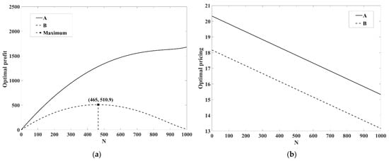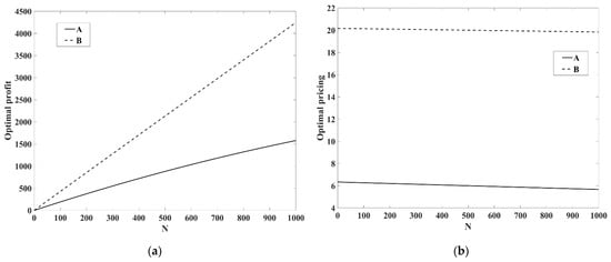 Figure 6 describes the changes of the optimal profit and the optimal pricing of the two suppliers in scenario . The difference from scenario is that supplier B, which provides value-added services at this time, has a smaller intrinsic value and network effect of value-added services. Supplier B obtains the pricing power due to its oligopolistic position, and its optimal pricing is much higher than that of supplier A. According to Result 7, the optimal profit of supplier B increases with the increase of the market size. Due to the smaller intrinsic value and network effect, supplier B’s optimal profit in scenario is lower than supplier A’s in scenario in terms of quantity and growth rate.