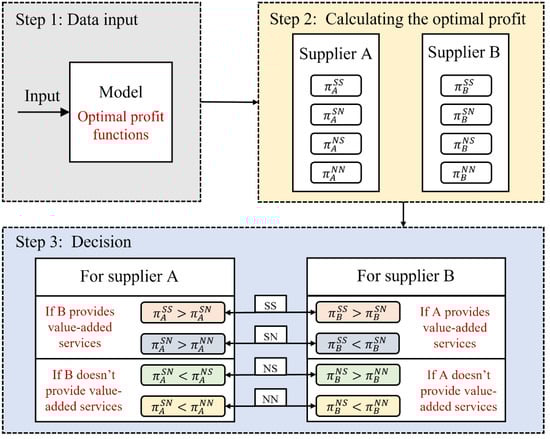 This section selected two hydrogen energy suppliers in Shanghai, China as a simulation case. The quality of hydrogen energy provided by these two suppliers is the same, but the marginal cost is different. In order to broaden the business scenario, both suppliers consider providing value-added services, but the content and scope of the services are different. In order to analyze whether there is a need for these two suppliers to provide value-added services, we conduct an example analysis based on the model constructed in this paper, and the analysis process is shown in Figure 8. The input parameters for the two suppliers are shown in Table 8. According to the calculation result in Table 9, and , so both suppliers A and B should provide value-added services.