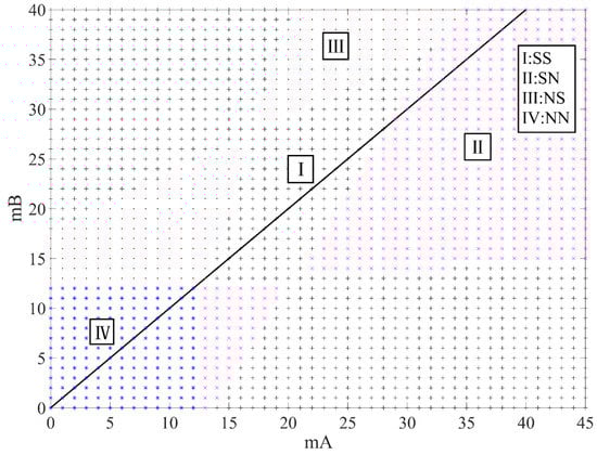 Furthermore, to facilitate supplier judgment, we directly calculated the parameter space of suppliers A and B regarding the intrinsic value of value-added services, as shown in Figure 9. It describes the strategy selection of the two hydrogen energy suppliers in the , parameter space. Where areas I, II, III, and IV represent SS, SN, NS, and NN market strategy equilibrium, respectively. The conditions of area I are and ; the conditions of area II are and ; the conditions of area III are and ; the conditions of area IV are and . The straight line in Figure 9 represents =, that is, the intrinsic value of value-added services of suppliers A and B are the same.