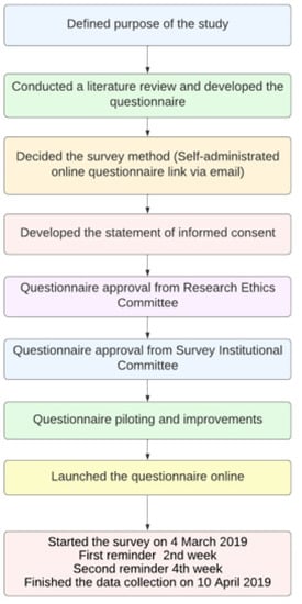 The study was conducted in Zayed University (ZU), which is a government university in the UAE, established in 1998 to provide higher education for UAE citizens. ZU comprises seven colleges in the following disciplines: business, communication and media sciences, education, humanities and social sciences, natural and health sciences, technological innovation, and interdisciplinary studies. More than 95% of the student population at ZU is enrolled in various undergraduate programs [63]. The university has two campuses: one in Abu Dhabi and another in Dubai. This study was granted ethics approval from ZU research ethics committee and the ZU institutional survey committee. Applicants whose research ethics application are approved receive a letter confirming the approval and are provided with an ethical clearance number together with other relevant information. The questionnaire was prepared in English. Data collection took place during 4 March–10 April, 2019, in ZU, Abu Dhabi, UAE. There was an invitation letter before the questionnaire page explaining to the participants the scope and purpose of the study. Only those who accepted and were satisfied to be part of the study proceeded further to fill the questionnaire. The completion time for the survey is approximately 10 min. The proposed methodology’s summary is indicated in the flow chart of Figure 2.