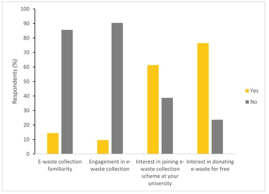 As shown in Figure 4, most (85.62%) of the respondents were not aware that e-waste was being collected by government authorities. Furthermore, 90.41% of respondents did not participate in e-waste-collection schemes organized by any authorities. However, 61.30% of respondents showed interest in joining e-waste collection at the university. Importantly, 76.37% of respondents showed inclination to donate the e-waste free of cost.