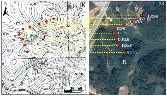 It is critical to determine whether the sampling sites are representative when studying soil erosion on a slope, due to the relatively limited investigation of spatial dimensions. Here, the following two factors must be considered when choosing sampling sites: (1) a representative hillslope should be chosen according to the geomorphic features in the study area; (2) sampling is performed at the top, shoulder, piedmont, foot, and valley for mountains with different altitudes (all on the same slope). Samples were collected from a small catchment in Shuanglong Village in Western Xinpu (Figure 2). The catchment is a typical karst erosion landform, with an area of about 0.52 ha, including two slopes, A and B. The terrain of the slope is undulating, the slope of the mountaintop and the mountainside is steep, and the slope at the foot of the mountain is gentle. Its altitude ranges from 850 to 960 m, and its slopes are steep, with an average angle of 40.58°. In the middle of the two slopes, there is a valley and flat land. The sampling points were located on two adjacent slopes, A and B, where the land-use type of slope A was orchard and the land-use type of slope B was woodland, and the trees were about 70 years old (the bottom of the slope was rice paddies). Four of these sites (EUC(1), EUC(2), DUC(3), and EUC (4)) were uncultivated profiles, and the other five sites (EC(1), DC(2), EC(3), EC(4), and DC(5)) were cultivated profiles. In order to accurately identify the existence of underground soil leak phenomena on the slope, all sampling sites were stratified. The stratified samples were stripped layer by layer with a blade in the area of 10 × 10 cm2 at intervals of 2 cm and to a depth of about 30 cm. A total of 135 samples in 9 profiles were collected.