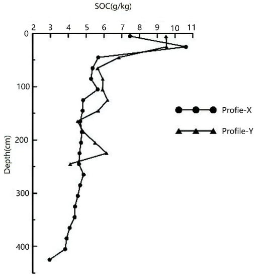 The enrichment of Zr in the surface of the soil profile is mainly due to changes in soil density, while the organic carbon of topsoil has a high correlation with density [41]. We studied and analyzed the distribution characteristics of SOC over the two profiles of the study area (Figure 3). The SOC of the two profiles increased sharply from 0 to 25 cm. The SOC content was drastically reduced using 25 cm as the boundary. From a depth of 25 cm to the bedrock, the change in SOC content was shown as an inverted L-type according to the depth of the profile. This meant that the SOC content decreased slowly as the depth of the profile deepened [42].
