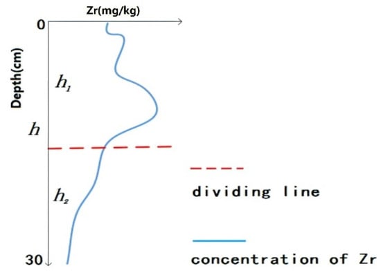 We produced an ideal concentration distribution map of Zr in the soil surface in this area (Figure 5). Zr is enriched at depths ranging from 0 to 25 cm. It decreases and remains stable at deeper areas. We used 0–25 cm as the weathered layer h1, and the soil layer below 25 cm is the parent material horizon h2.
