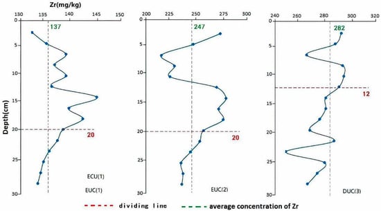 Below the dividing line, the Zr concentrations of EUC(1) and EUC(2) rapidly decreased with increasing depth, and the Zr concentration of DUC(3) showed an overall decreasing trend with depth and with apparent variation. The erosion profiles of EUC(1) and EUC(2) both showed in situ weathering, and their upper and lower parts showed apparent chemical differentiation under the influence of chemical leaching. The depositional effect in profile DUC(3) was also visible, and the erosion transport mud (insoluble material) covered the topsoil—the chemical differentiation was weaker than that in EUC(1) and EUC(2). The Zr contents in EUC(2) and DUC(3) decreased significantly after 8 cm. No similar phenomenon was observed in EUC(1). The Zr concentration significantly decreased 8 cm below the topsoil in profiles EUC(2) and DUC(3), perhaps because of a biological effect. This is based on the observation of vegetation coverage at sampling sites EUC(1), EUC(2), and DUC(3). The vegetation coverage at EUC(1) was significantly lower than that at EUC(2) and DUC(3), and various activating elements (for instance, heavy metal elements) could be absorbed and accumulate at the root of vegetables. Thus, the accumulation of activating elements in turn lowered the Zr concentration.
