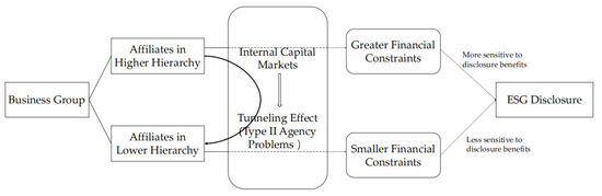 From the perspective of organizational structure, China’s business groups are mostly organized in a pyramidal structure [27]. However, pyramidally controlled groups usually have more serious agency problems (Type II agency problems) since the pyramid structure increases the degree of separation between control and cash flow rights [47,48]. This separation of control and cash flow rights exacerbates the self-interest motive of the majority shareholders and generates the tunneling effect [43,49]. The tunneling effect in pyramidally controlled groups refers to the controlling shareholder at the top of the pyramid (lower pyramid level according to the length of the control chain) using the firms at the bottom of the pyramid (higher pyramid level according to the length of the control chain) as a financing platform and performing “hollowing out” on it [43,44]. The wealth transfer behavior by the majority shareholders (shareholders at the top of the pyramid) at the expense of minority shareholders (shareholders at the bottom of the pyramid) may impair the interests of the minority shareholders [50] and amplify their financing restrictions. As a result, the member firms at the bottom of tge pyramid may be more willing to disclose ESG-related information than the firms at the top of the pyramid because they need to attract external investors and obtain external financial support. Conversely, member firms at the top of the pyramid will be less sensitive to positive market reactions to ESG disclosure because they can obtain funding through wealth transfer behaviors. Figure 2 shows the corresponding mechanisms of the above analysis. Given this, we propose the following hypothesis: