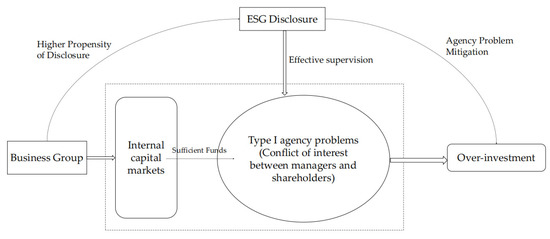 For group affiliates, the existence of internal capital markets allows group affiliates to get free cash flow, and sufficient capital makes it easy for managers to expand investments blindly, resulting in over-investment without effective supervision [54]. This is supported by the study of Biddle et al. (2009), who found that cash-rich firms are more prone to over-investment due to the empire-building motivation for managers [55]. In this case, stronger external supervision can be introduced to inhibit managers’ agency behavior, thus alleviating over-investment and improving corporate investment efficiency. Some studies show that firms that actively participate in environmental and social activities can strengthen their interaction with stakeholders and value stakeholders’ interests more [7,56]. Therefore, when business groups make ESG disclosures, they are subject to greater stakeholder scrutiny while mitigating agency problems and reducing over-investment. That is, a higher propensity of ESG disclosure for group affiliates may play an external monitoring role and mitigate the agency problem caused by the self-interest motivation of managers due to sufficient funds among the business group, thus reducing the over-investment of group affiliates. We show the possible mechanisms in Figure 3. Given this, we propose the following hypothesis: