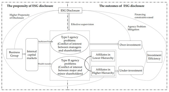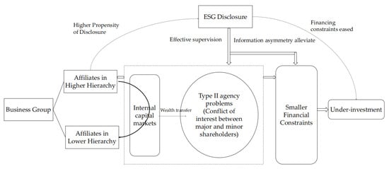 The tunneling problem of the pyramid structure makes the investment efficiency of member firms different. Fan et al. (2008) argued that the pyramid structure allows internal capital markets of the business groups, which were originally intended to improve the efficiency of capital allocation, to be partially alienated as a channel for the transfer of benefits to controlling shareholders [57]. When intra-group resources are transferred from bottom firms to top ones, the degree of financing constraints of bottom firms will increase, leading to their under-investment. ESG disclosure is helpful for the improvement of investment efficiency. First, ESG-related disclosure can compensate for company-related information that financial reports cannot reveal and reduce the level of information asymmetry between firms and external investors [58,59]. By disclosing ESG-related information, affiliates at the bottom of the pyramid can obtain support from external investors, thus alleviating corporate under-investment due to financial constraints. Second, the tunneling problem is an agency problem, which is usually caused by the misalignment of interests between the controlling shareholders and the minority shareholders [44,49]. Since corporate governance information (G) is one of the elements of ESG disclosure, effective monitoring by group stakeholders for the overall interest of the group will curb the agency problem within the group, thus reducing the occurrence of tunneling behavior and improving the investment efficiency. The above mechanism analysis is clearly illustrated in Figure 4. Given this, we propose the following hypothesis: