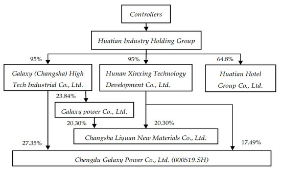 It is generally believed that a business group is an organizational structure formed by many member firms with independent legal personalities through formal or informal associations [61]. From the perspective of the group formation and development process, business groups are large cross-regional and cross-industry economic consortia formed through asset restructuring or mergers and acquisitions, marked by capital association and cross-shareholdings. In this paper, referring to He et al. (2013) [25], we determine that the affiliates belong to the same group according to the following steps: (1) manually identify the ultimate controllers of listed firms based on the ownership structure disclosed in their annual reports; (2) treat listed firms that can be traced to the same ultimate final controller as belonging to the same business group, and define the group dummy variable equal to one. An example of the ownership structure of a business group is shown in Figure 6.
