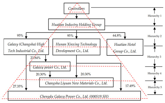 Business groups in China are formed by typical pyramid organizational structures [27], where the ultimate controller is usually at the top of the pyramid and indirectly controls the subsidiaries through several intermediate firms at each level. The pyramid structure allows the controller to gain control of the subsidiary with a small amount of cash flow rights [44]. The longer the intermediate chain of the pyramid, the larger the size of the assets controlled by the controlling shareholder with the same wealth, and the controlling shareholder located at the top of the pyramid has greater power to deploy resources. According to Fan et al. (2005) [27], we calculate the hierarchy of member firms based on the length of the control chain up to the ultimate controller, and Layer is a proxy variable of the pyramid hierarchy of member firms. For example, when the ultimate controller directly controls the enterprise, Layer is equal to 1; and when there is only one intermediate controller between the ultimate controller and the enterprise, Layer is equal to 2, and so on. The smaller the Layer, the closer the firm is located to the top of the pyramid, with more resources to deploy and enjoy a greater wealth effect. The pyramid hierarchy of Huatian Industrial Holdings Group, as an example, is shown in Figure 7.