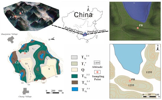 The study karst area is located in the central part of the Guizhou Province, Southwest (SW) China (Figure 1). The climate in SW China is humid, and the karst landform is widely developed in the Guizhou and Yunnan provinces. The karst terrain in this area is one of the largest continuously distributed karst landforms in the world. The study area has a subtropical monsoon climate, controlled by the East Asian summer monsoon, the Indian Ocean monsoon, and the Tibetan Plateau monsoon. The annual precipitation is 1100–1300 mm, and the rainy season is from May to October, accounting for 70–85% of the annual precipitation. The weather is relatively mild, and the annual average temperature is above 15 °C []. The PB profile (26°26′ N, 106°22′ E) is located in Pingba County, about 40 km southwest of Guiyang, the capital of the Guizhou Province. The sampling points are near Hongfeng Lake. The bedrock is sedimentary dolomite, belonging to the Triassic Anshun Formation. Profiles CZ and CY (26°21′ N, 106°31′ E) are located in the Chenqi watershed of Puding County, about 50 km southwest of Pingba. The dominant lithology of this watershed is the limestone of the Guanling Formation of the Triassic system [,]. The sampling points and regional lithology are shown in Figure 1.
