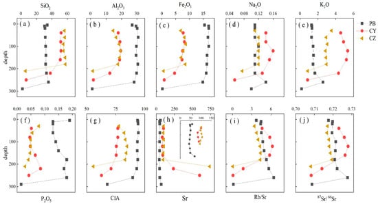 Distributions of selected elements and changes of several relevant parameters along with the vertical sampling depth. (a–j) represent the changes of SiO2 Al2O3, Fe2O3, Na2O, K2O, P2O5, CIA, Sr, Rb/Sr and 87Sr/86Sr with depth respectively. The unit of the major element is wt.%, and the unit of Sr is μg/g.