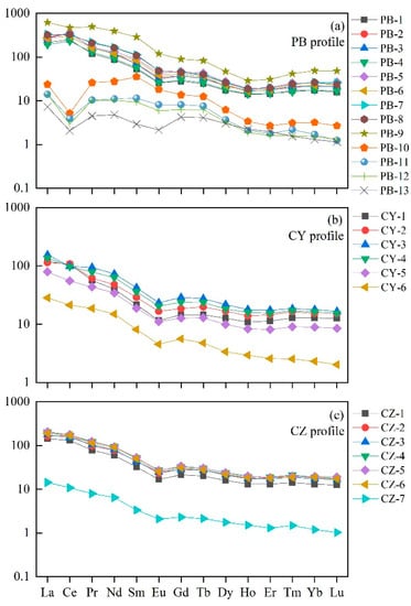 The maximum range of REE content is 354.96–994.65 in the PB profile with an average value of 535.64 (Table 3). At the same time, the PB profile has a higher degree of fractionation between light and heavy rare earth elements with (La/Yb)N = 10.49–13.10. In contrast, the content of REE in limestone profiles CY and CZ is lower than in the PB profile, as well as the fractionation degree between light rare earth elements (LREE, La, Ce, Pr, Nd, Pm, Sm, and Eu) and heavy rare earth elements (HREE, Gd, Tb, Dy, Ho, Er, Tm, Yb, and Lu). The content of REE in the CY profile ranges from 111.18 to 218.59, with an average value of 166.16, whereas the content in the CZ profile ranges from 221.65 to 303.05, with an average value of 247.39 (Table 4). The (La/Yb)N are 7.48–9.24 and 8.86–10.98 in CY and CZ profiles, respectively. In addition, the ratio of LREE/HREE (14.01–17.16 in PB profile, 7.72–10.70 in CY profile, and 10.07–10.64 in CZ profile) shows that compared with HREE, the enrichment of LREE in the three profiles is higher. The chondrite-normalized REE pattern displays a right-leaning trend, which is also indicative of the enrichment of LREE (Figure 3). In the REE pattern, the PB profile shows a significant Ce anomaly (δCe = 0.85–1.7), whereas the Ce anomaly is not obviously in the limestone profile CZ and CY.