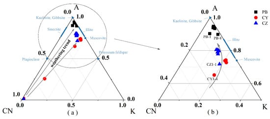 A–CN–K ternary diagram of the profiles (arrows indicating weathering trend). (b) is the part of the circle in (a).