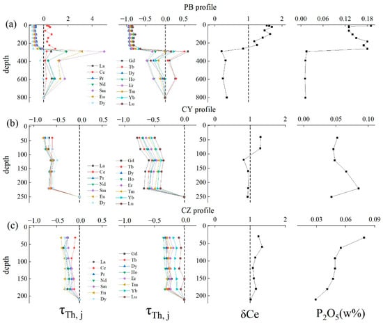 Depth variations of τTh,REE, Ce anomaly and P2O5 content in study profiles. (a–c) represent the τTh,REE, Ce anomaly and P2O5 content in PB, CY and CZ profiles.