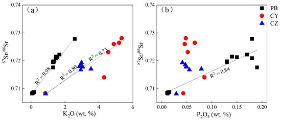 The PB profile is a typical carbonate weathering profile. It can be seen that CaO has a good correlation with 87Sr/86Sr (Figure 6b); however, in the strong weathering and leaching environment, the carbonate rocks are leached and decomposed, and the CaO-containing mineral may not be carbonate rock but apatite []. The consistency of the Ce anomaly and P2O5 content change (Figure 5), and the high P2O5 content in the PB profile, indicates the possibility of apatite, and previous studies on Guangxi red soil also proved that the presence of apatite may be affected 87Sr/86Sr. We analyzed the correlation between P2O5 and 87Sr/86Sr and found that only P2O5 and 87Sr/86Sr in the PB profile have a good correlation, which proves that apatite is also a factor that affects the Sr isotope in the PB profile (Figure 6).