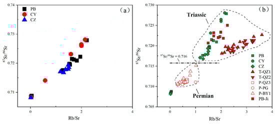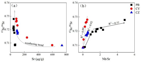 In the open superficial environment, Rb-containing minerals (mainly mica and potassium feldspar) are more resistant to decomposition than Ca (and Sr)-containing minerals (mainly feldspar and calcite) [,]. Due to different weathering rates of different minerals, the weathering process usually leads to changes in Rb and Sr concentrations and leaching rates of radioactive and non-radioactive Sr [,,,]. Generally, minerals with a high Rb/Sr ratio have good weather resistance and a high 87Sr/86Sr ratio; therefore, the ratios of Rb/Sr and 87Sr/86Sr of soil profile samples increase with the increase of weathering intensity. The Rb/Sr and 87Sr/86Sr ratios of the study profiles are significantly positively correlated (Figure 8a). The strong linear relationship indicates that the radiogenic 87Sr is mainly derived from 87Rb decay, and the weathering decomposition of Rb-containing minerals leads to the loss of Rb and radiogenic 87Sr/86Sr from the weathering system, whereas the contribution of the heterogeneous is very limited. Compared with profiles PB and CZ, the ratios of Rb/Sr and 87Sr/86Sr in profile CY are higher, which may be due to the weaker weathering degree and residual minerals with a high Rb/Sr ratio.