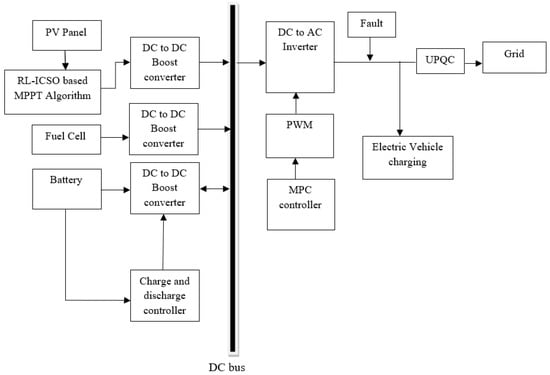 This section is the illustration of a detailed explanation of the proposed system. In this portion, a comprehensive explanation of the proposed system is given. The presented system flow, on the whole, is depicted in Figure 1. The implementation of a multi-renewable energy source (battery, fuel cell, and PV panel) based dc bus system along with an optimization approach is presented. In the presented technique the power efficacy of the DC system is further enhanced by introducing an RL-ICSO-based MPPT algorithm. The RL-ICSO MPPT method incorporated is predictable for the purpose of adjusting the parameters of MPC controllers. In this approach, compensating voltage harmonics and current harmonics liability properly is made by connecting series and shunt controllers. Hence, in this approach, an intelligent power and energy management system is presented with the use of a reinforcement learning-based optimization strategy that can learn the optimal policy. The generated energy is checked for any liabilities by adding some fault in the transmission line and thereby rectifying the fault by means of the UPQC device. The fault-rectified power is stored in the grid and the transmitting power can be used for electric vehicle charging. Then, the load is stored in the grid which can be used for further usage. The overall flow of the proposed system is shown below: