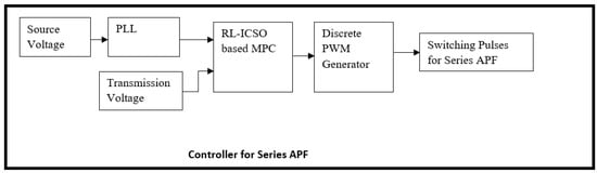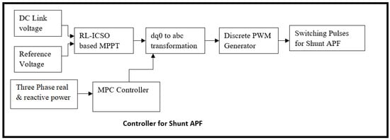 The Pulse Width Modulation (PWM) pulses converters can be produced with a topology of two levels by the PWM generator block. The pulses are formed by contrasting a triangular waveform with a modulating signal of comparison. The secondary switches are driven by a PWM signal in the grid-connected operating mode, determined by the PWM generator of the gridline frequency. It is possible to produce modulation signals by the PWM generator itself, or they can be related by a vector of external signals at the block input. To produce the pulses, one reference signal is required. The phase, frequency, and amplitude (modulation) of the reference signals are controlled by output voltage on the AC terminals of the inverter associated with the block of the PWM Generator. Figure 2 and Figure 3 depicts the Shunt and Series APF Controller.