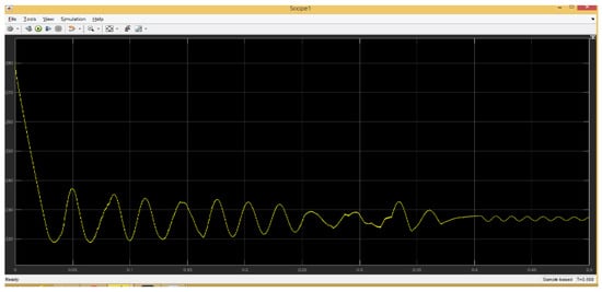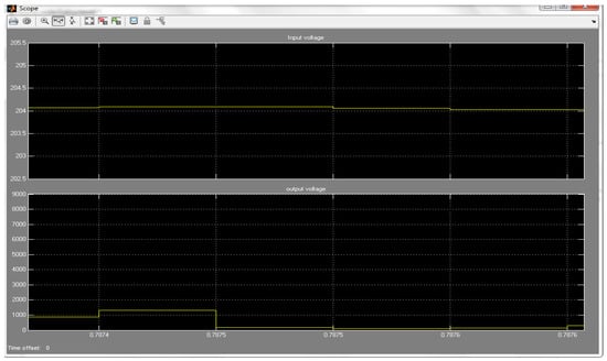 The battery voltage analysis is denoted in a graphical form in Figure 4. In this, the fluctuation of power is eliminated, and the power of voltage is maintained. The given input voltage is represented by the top yellow line and for the given input voltage there is the occurrence of some fluctuations which should be eradicated. In this system, the power voltage is maintained without fluctuation on the output side and is represented by the bottom yellow line. The input voltage of the battery provided is boosted and the voltage is enhanced on the output side.