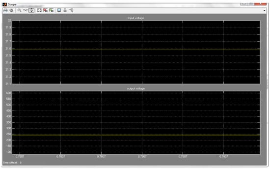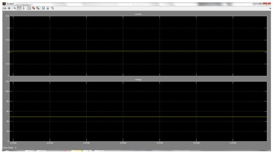 The analysis of PV current and voltage is signified in a graphical in Figure 5. In this, the fluctuation of power is eliminated, and the voltage influence is maintained. The voltage and current flow in the PV source in the transmission line is represented. The attained output shows that there is no fluctuation in the voltage and current flow of PV. The input voltage and current of the PV provided are boosted and the voltage and current are enhanced at the output side.