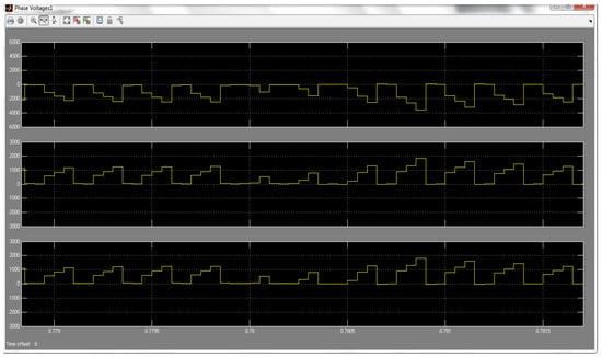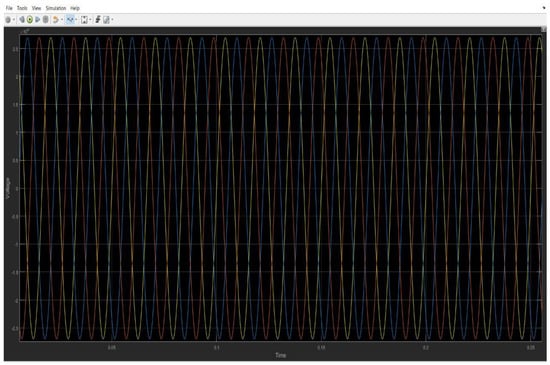 The three-phase voltage analysis is represented in a graphical form provided below in Figure 7. The three-phase voltage flow in the transmission line is signified and the occurrence of distortion in the voltage flow is indicated. The analysis shows the voltage of three-phase variation and distortion in the transmission line.