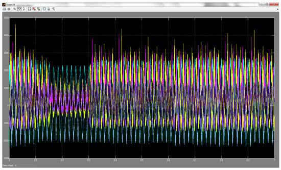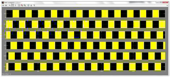 The inverter switching pulses are shown in a graphical form in Figure 8. In this, the switching pulse given to the inverter is represented. The switching pulses are indicated in yellow and black colors so as to differentiate the 0′s and 1′s pulses.