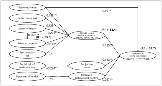The analysis results indicated that intention to use is negatively affected by perceived security threats (β = −0.276), social risk associated with malicious use (β = −0.224), perceived performance risk (β = −0.125) and perceived privacy concerns (β = −0.110), respectively. These results indicate that security threats are the most important factors among the variables that negatively influence attitude; this is consistent with [35]’s results. This finding implies that even online-security-community users, who may be highly specialised in computer security, have a great deal of concerns about security threats such as the illegal monitoring of computer activities, loss of sensitive information and corruption of system data. It is because a malware infection is not easily identified unless antimalware software successfully detects it. Moreover, the respondents also had privacy concerns. However, the effect of privacy concerns is modest, as these communities do not require much personal information due to the security threats. Additionally, security threats are found to positively influence privacy concerns (β = 0.565), which is the strongest factor among all predictors in the proposed model. Moreover, among the six types of perceived risk, security threats show the strongest negative indirect influence on attitudes, suggesting that privacy concerns and attitudes mediate the relationship between security threats and intention to use significantly.