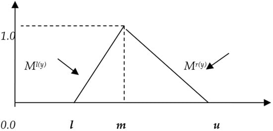 Tildes “∼” are placed over symbols that signify FSs. Figure 1 shows a TFN. The TFN is (l/m,m/u) or (l,m,u). The parameters l, m, and u represent the least promising, most promising, and greatest potential values for a fuzzy event. The TFN’s membership function is: