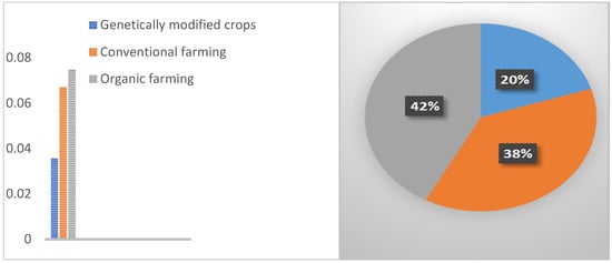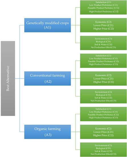 According to the study, crops grown using organic farming methods have a higher value in terms of consumer satisfaction and environmental impact, but a lower value in terms of price rate. Crops grown using conventional farming and genetic engineering techniques have low product prices due to their high production capacity, but they have lower value in terms of consumer satisfaction and environmental impact. In the application, the hierarchical model’s dimensions and criteria were compared pairwise. The comparison matrices’ consistency ratios are below 0.10 (CR 0.10).