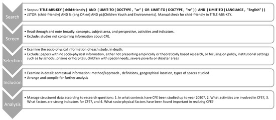 Screen: After the search, all results with the search term “child-friendly” in the title, keywords, or abstract were limited further by a read-through, where the screening criteria were focused on CFE. This included noting the overarching variables relating to CFE used in each paper, particularly the central concepts, subject areas and perspectives, activities, and directly mentioned or indirectly highlighted indicators. At the end of the screening, studies with none or very little information centered on CFE were, hence, excluded.