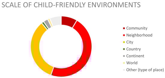From its first mention in 1998 until 2020, there has been an increasing number of peer-reviewed papers that have been dedicated specifically to the study of CFE; this includes specifying terms, such as child-friendly cities, spaces, communities, urban environments, neighborhoods, play spaces, integrated public spaces, routes, planning, tourism environments and high-density environments/neighborhoods. Correspondingly, the vast majority of studied examples were public spaces at either the city, neighborhood, or community scale (Figure 2), while very few tackle the wider lens of a country or continent or a global perspective. Most studies focus on a particular type of space (playgrounds, heritage sites, transitory zones, public spaces, etc.), and use one of the original frameworks to build upon. Over half of the studies directly mention the “Child-friendly Cities Initiative” (UNICEF) as a framework, with some additions going back to the original vision statement in the UNCRC [36]. The others reference the same source material framing child-friendliness: Kyttä [16] (affordance theory), Kreutz [30] (transactional theory), and Horelli [21] (child-friendly environments), demonstrating how the various child-friendly terms have been developed in a similar theoretical context and can often be used interchangeably.
