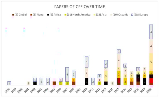 Although the studied examples of CFE have a common conceptual framework, each study expresses a unique perspective. Most studies performed in the earliest stages of development of the concept stem from communities in European countries (with significant representation, particularly from Finland). Although the last decade has seen an increasing variation in this respect, with increases in CFE studies from communities in Oceanic and Asian countries (Figure 3), there are still notable absences from South American countries.